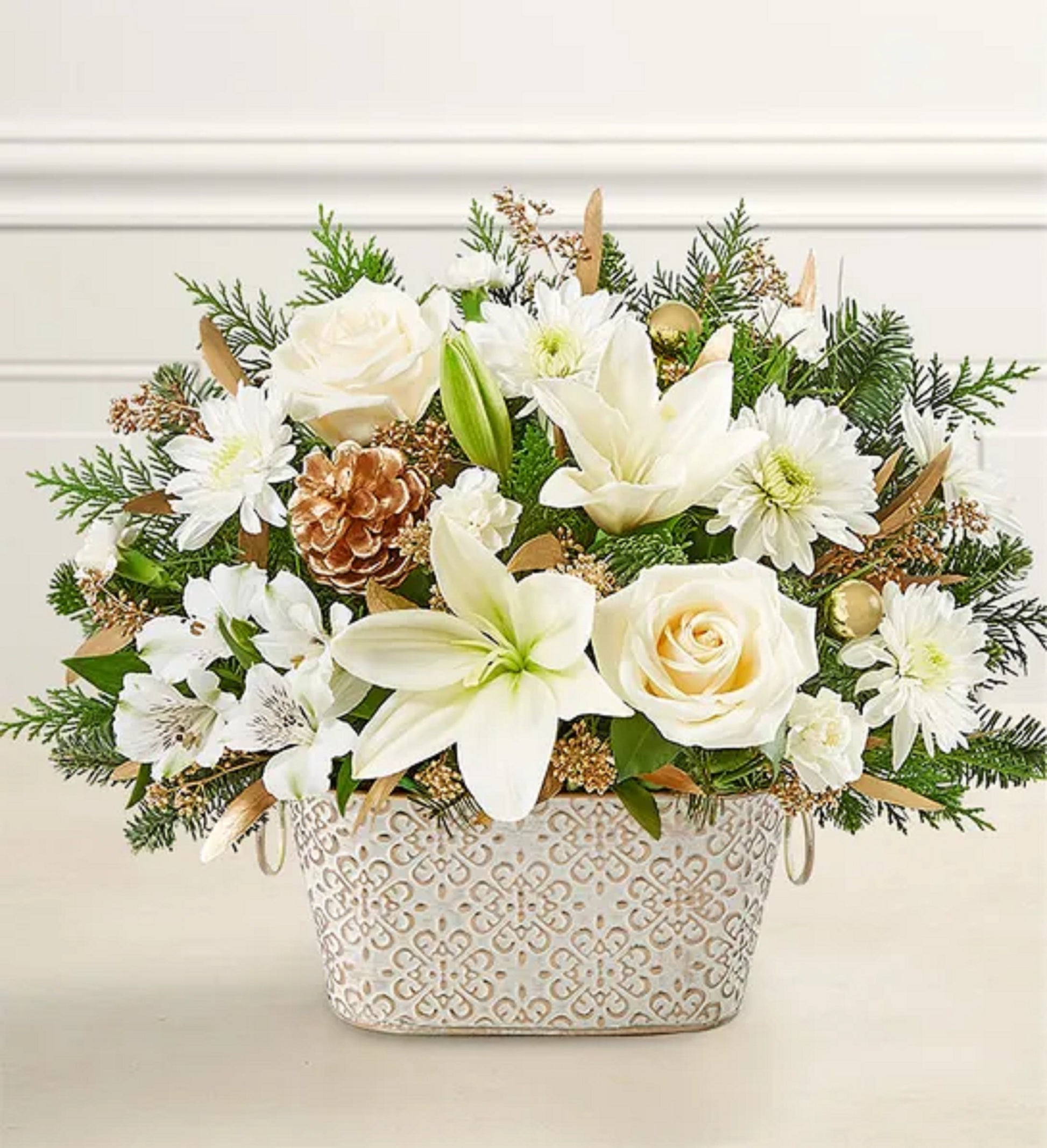 Share the warmth and wonder of winter. Our elegant arrangement is gathered with soothing cream and white blooms, along with lush greenery. Gold ornaments and dusted pinecones add a touch of shimmer. Designed in our Cachepot, featuring an embossed pattern and gold brushed ivory surface, this gift captures the season’s enchantment in every way.