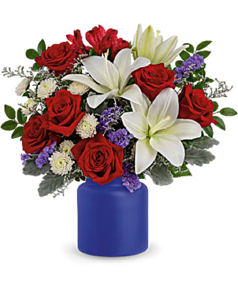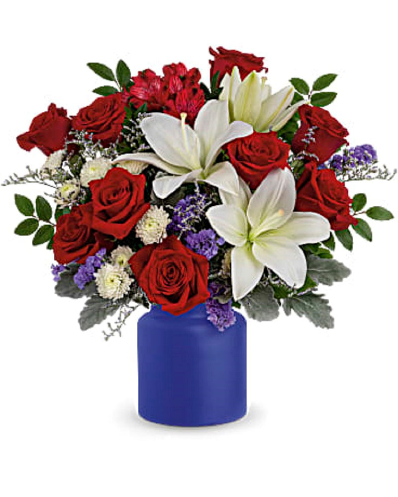Revel in the crisp, classic color scheme of pristine white lilies and radiant red roses, presented in a cobalt-hued, frosted glass jar.